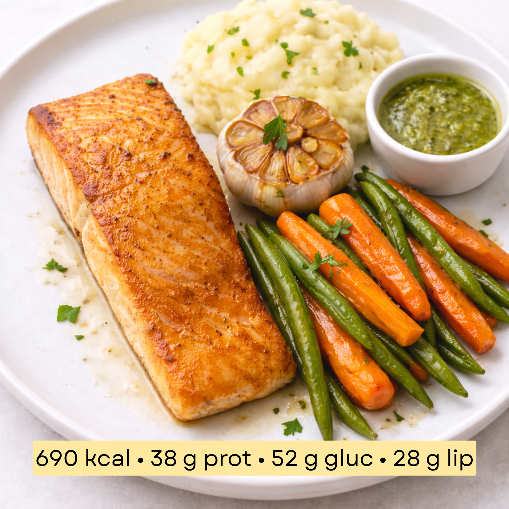 Ingrédients : Filet de saumon, pommes de terre, haricots verts, carotte, ail, ciboulette, crème végétale, citron, huile d’olive, sel, poivre.